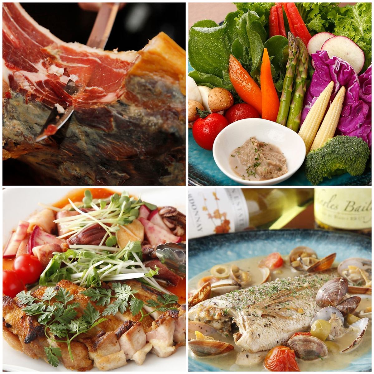 アラカルト料理は、生ハム、アヒージョ、アクアパッツァ、ムール貝のワイン蒸しなど定番の料理から、季節ごと旬の食材を使ったおすすめ料理やジビエ料理など充実のラインナップで皆様をお待ち致しております。常時ワインセラーには、赤・白ワインや泡等100種を常備!ワインに合う、食事に合うワインのご提案も致します。